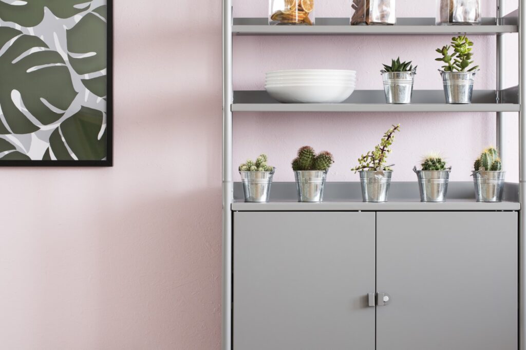 A szürke bútorok remekül mutatnak rózsaszín falakkal. A szürke eleganciája és kifinomultsága tökéletesen harmonizál a rózsaszín romantikájával és játékosságával.